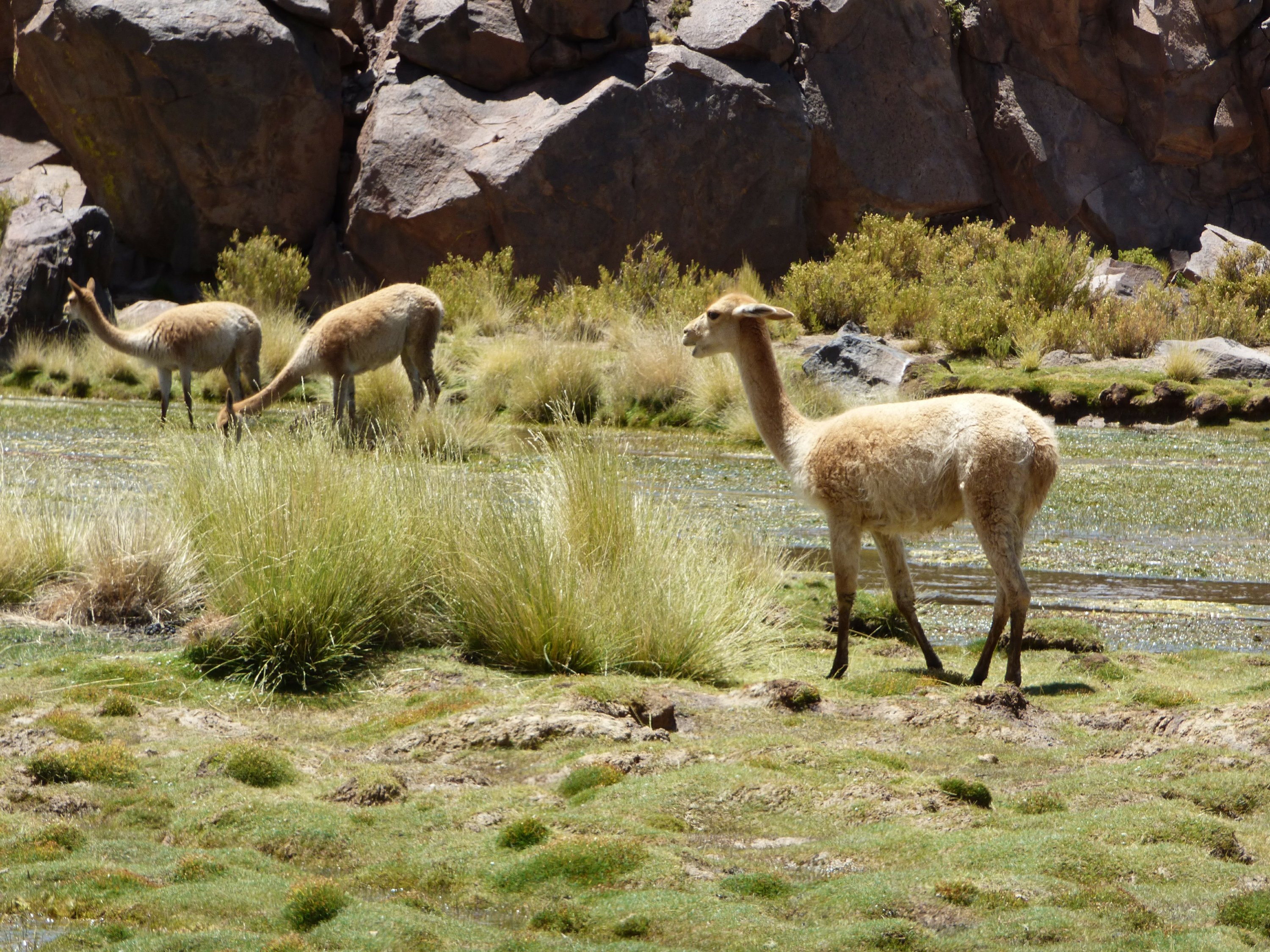 Den nächste Tag ging die Strasse sanft aber stetig bergauf. Nach nur 70 km blieben wir zur weiteren Höhenaklimatisierung an einer Lagune in 3200 Meter höhe mit Vicunas und Rosa Flamingos.